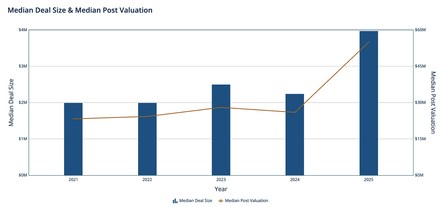 Deal sizes doubled over this period while valuations more than doubled. The market has shifted toward backing more mature companies with proven traction rather than spreading money across early-stage bets.